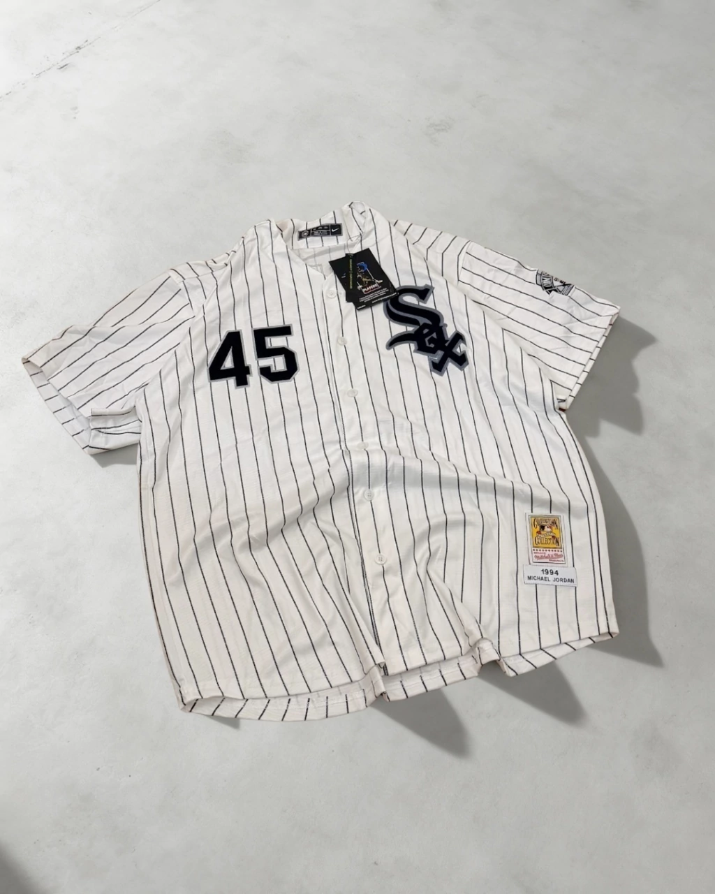Camiseta Chicago White Sox MLB inspirada en la histórica temporada 1994, cuando Michael Jordan sorprendió al mundo jugando béisbol profesional tras su retiro temporal de la NBA. Presenta el número 45, dorsal utilizado por Jordan durante su paso por la organización de los White Sox. Diseño clásico a rayas con botones frontales y escudo oficial del equipo, confeccionada en tela liviana y respirable. Una prenda icónica que fusiona deporte, historia y streetwear.